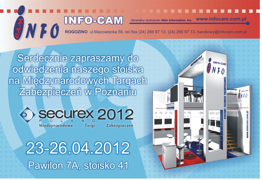 Mamy zaszczyt serdecznie zaprosić do spotkania się z nami podczas Międzynarodowych Targów Zabezpieczeń SECUREX 2012 w Poznaniu. Targi odbędą się w dniach 23-26 Kwietnia 2012 na terenie Międzynarodowych Targów Poznańskich. Podczas wystawy zaprezentujemy w działaniu najnowsze rozwiązania techniczne w dziedzinie monitoringu wizyjnego. Zapraszamy również do wzięcia udziału w specjalnie przygotowanym konkursie, w którym każdego dnia trwania imprezy do wygrania będą cenne nagrody.